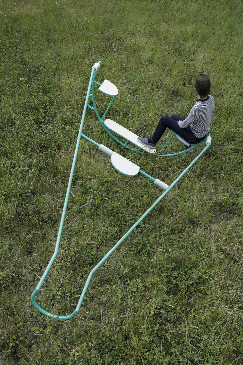 The experimental playground equipment in Capucine Diancourt’s ‘LOOSE PLAY’ range explores what such objects could be like if they were designed without the restrictions of safety regulations. Not only are the shapes different, they also have an immediate effect on playing itself. The objects, free-standing and balancing, evoke a different kind of behaviour than regular swing sets, seesaws or climbing frames. They trigger curiosity and demand cooperation between players. Their mobile nature means they can be placed in different environments and create exciting new places to meet and play together.