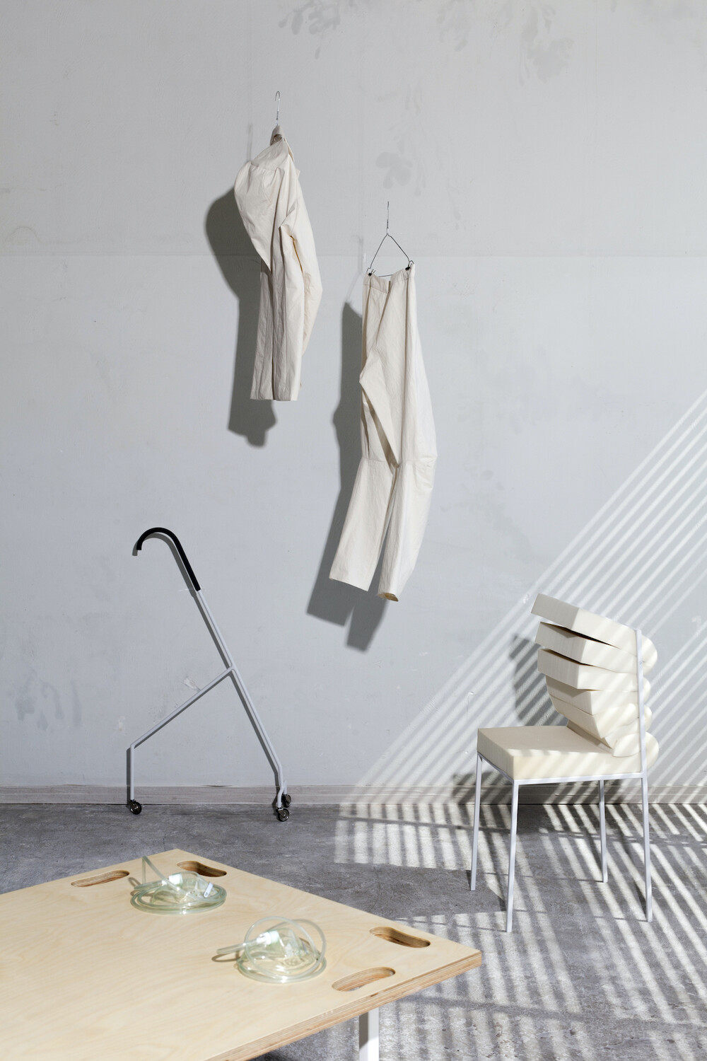 Our modern society is largely sedentary. We spend our days sitting, at home and at work. This causes all sorts of ailments, from back pain and hernias, to osteoporosis and weak abdominal muscles. ‘Sedentary Laboratory’ by Dorota Gazy is a vision of the future: objects tailored for bodies deformed by our current inaction. A cane maintains balance for weakened legs, a chair supports our bent backs, an oxygen mask feeds brains slowed by lack of movement and a suit is sewn with a hunched back and trouser legs shaped into a constant sitting position. It’s a preview of tomorrow today. You have been warned.