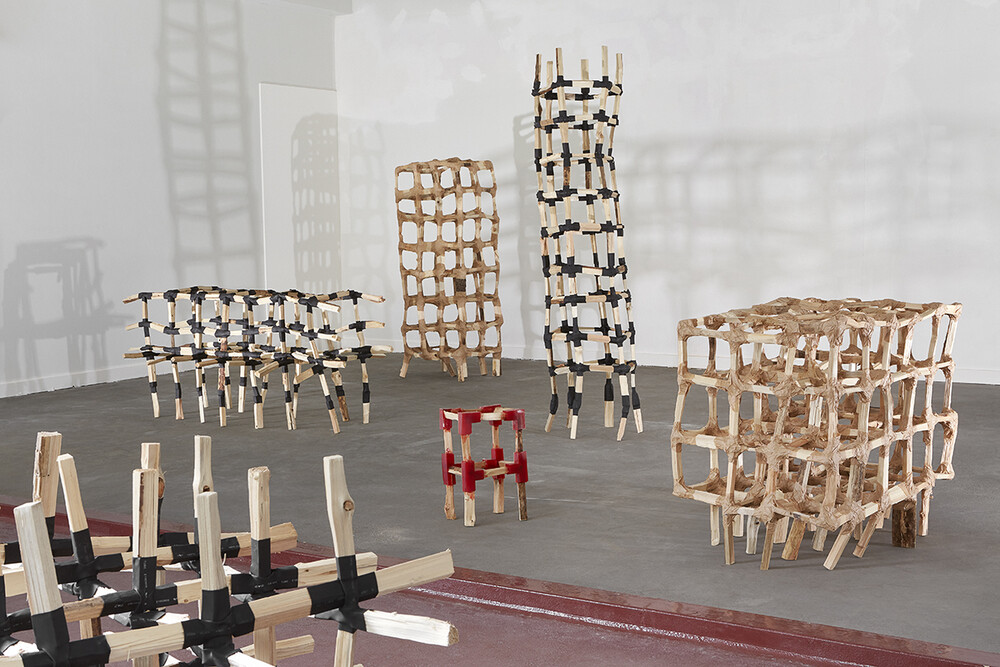 Fascinated by the beauty of downfall and decay, Gerard Lukken started to build with chopped firewood, using nothing but paper tape, heat shrink tubing and rubber to connect the pieces. ‘Wanky Wonky’ challenges standard construction norms: why make things straight and solid, when the thrill lies in that exhilarating moment of finding or losing balance? Depending on the chosen connection, each modular structure shows its own behaviour. Together they form a family of skeleton-like creatures that creak and sway, daring you to touch and use them. Could these be a bookcase, a bedside table or a pergola? Do not worry if they start to fall apart; that is part of the attraction.