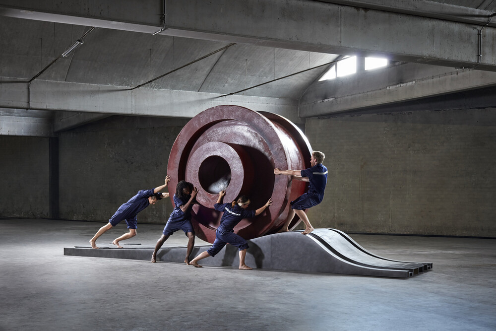 How: People try and push an enormous wheel up a sloped track. The visual evokes the incredible effort that locals have invested and the heavy sorrow weighing them down after the company that they have worked so hard for is now seeking its fortune elsewhere.