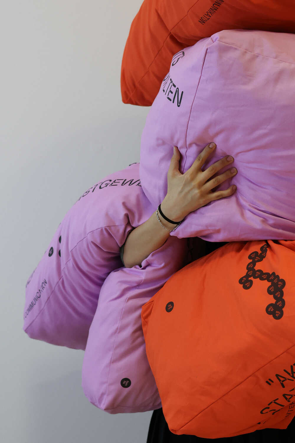 Louisa’s role involved leading her team in developing a multimedia exhibition, which included a wall infographic explaining The Society Forum process, a film featuring interview snippets with the assembly participants about democracy and the citizen assembly, filmed by Karnik Gregorian (interviewer, and filmmaker) and Uwe Wrobel (filmmaker). The exhibition also featured a tablet displaying The Society Forum website, developed by the team. They intended to incorporate a physical element into the exhibition – conversational objects initially planned to be produced by an external supplier. However, after an issue with the supplier, the team rented a small office space for two days, organising a team of 10 people to cut and sew fabric for the pillows. The graphics were printed by Peter van Ede, who has worked with numerous DAE alumni and graduating students. These pillow-like objects have been used as elements for hugging, sitting on, or playing with, adding an interactive dimension to the exhibition.